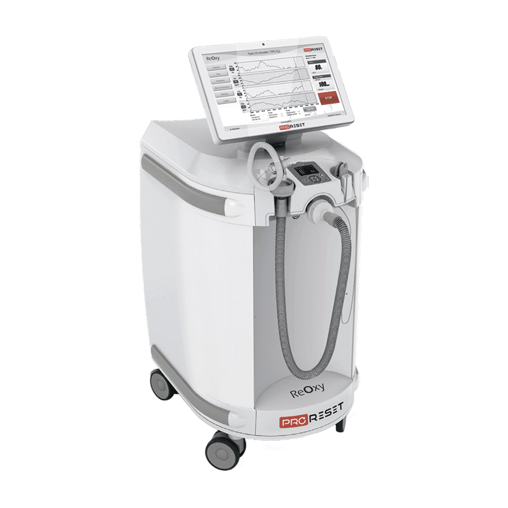 ProReset ReOxy is an advanced oxygen therapy system designed to support recovery, enhance performance, and promote healthy aging through personalized breathing protocols based on controlled oxygen variation.